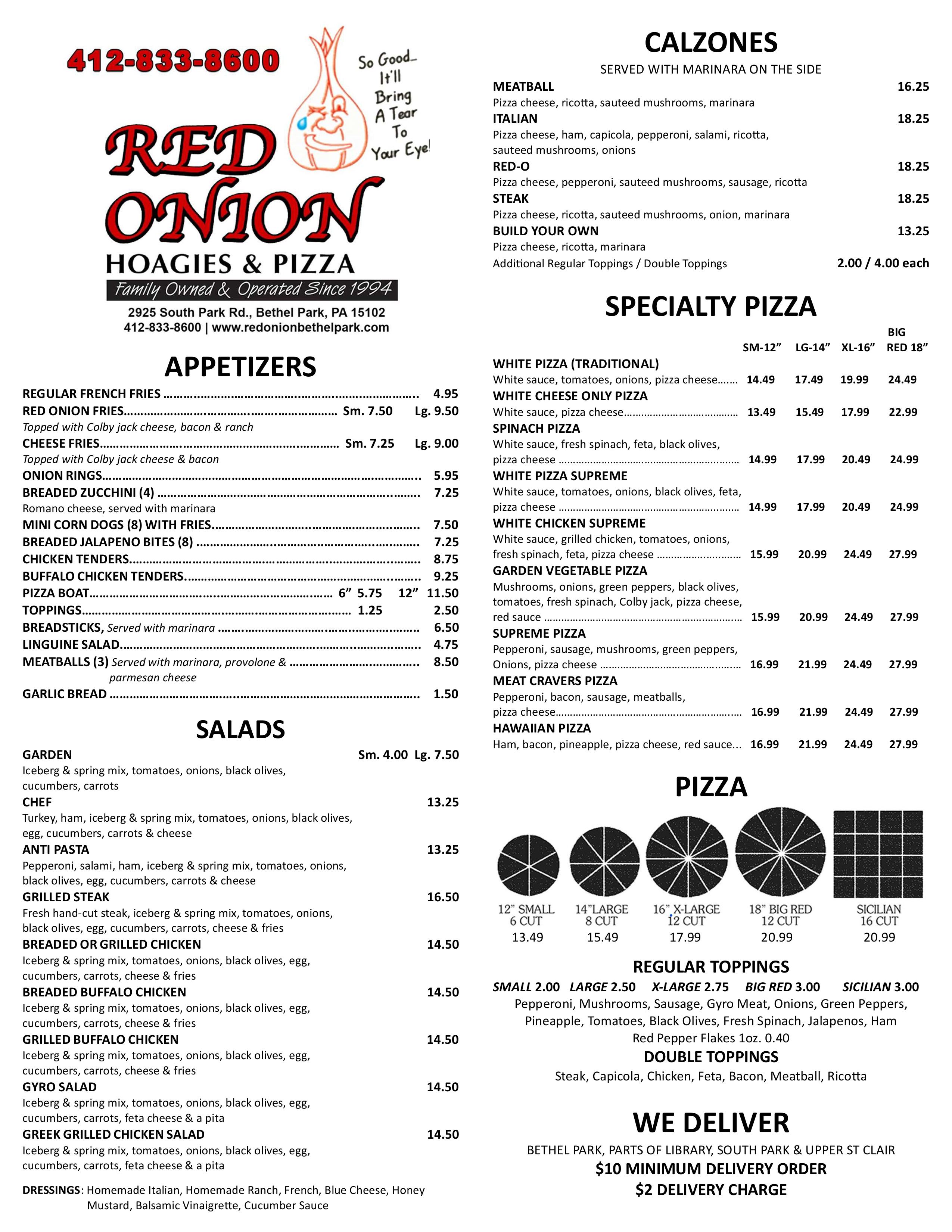 Red Onion Hoagies & Pizza offers a wide selection of appetizers, salads, pizza, calzones, pasta, subs and wings with delivery seven days a week!